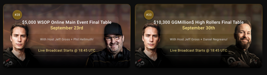 | Sep 29 | Mon | 18:00 | #33: $10,300 GGMillion$ High Rollers, $10M GTD [Day 2] | $10,300 | $10,000,000 |
