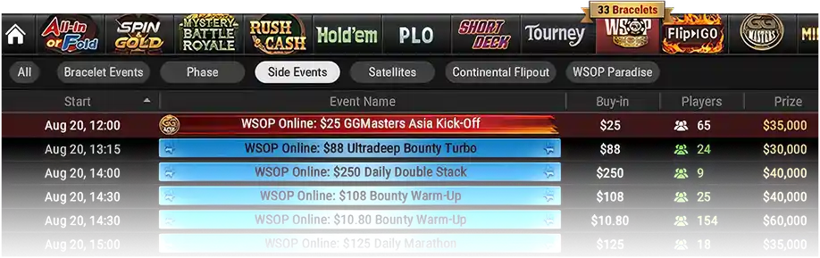 | Sep 14 | Sun | 17:00 | #21: $1,500 WSOP GGMasters HR Freezeout NLH | $1,500 | - |