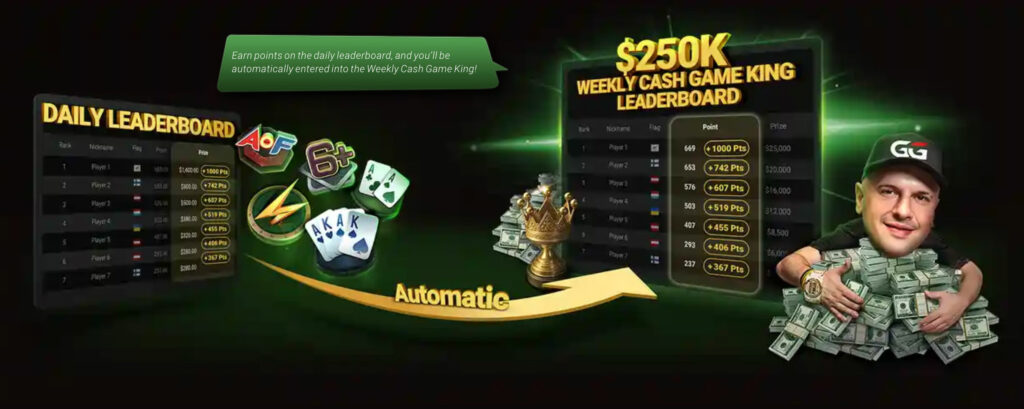 Place on the daily leaderboard, earn points, and compete in the $250K Weekly Cash Game King!