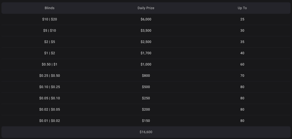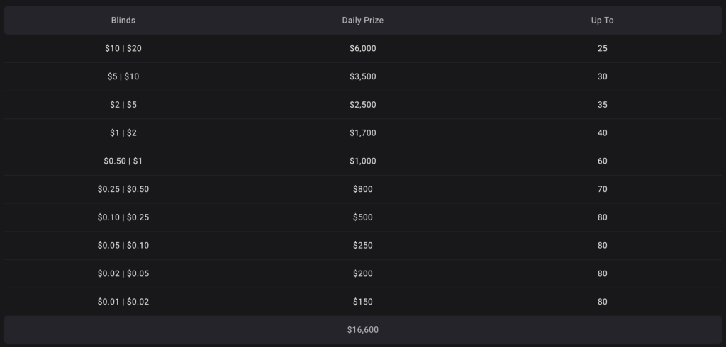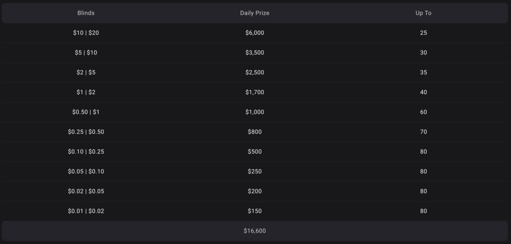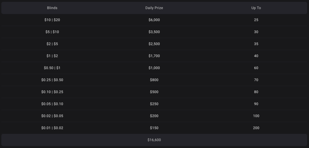 • Points will only be accumulated across the stakes and blinds featured on the promotional leaderboards.